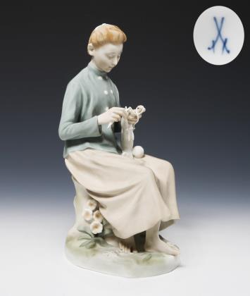 Jugendstil-Figur: Mädchen, strickend. Meissen.