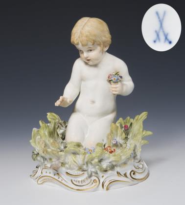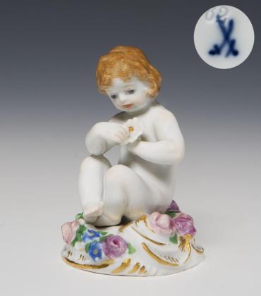 Miniatur-Jugendstilfigur: Kind mit Gänseblümchen. Meissen.