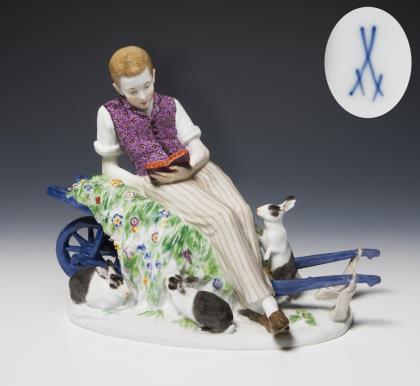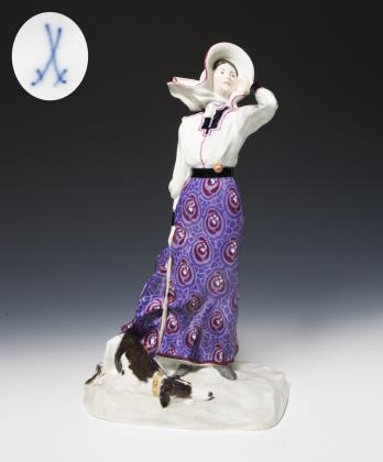 Jugendstil-Figur: Landmädchen mit Wachtelhund. Meissen.