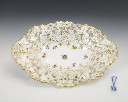 Ovale Schale mit teils durchbrochenem Efeurelief, im Spiegel Streublümchenmalerei