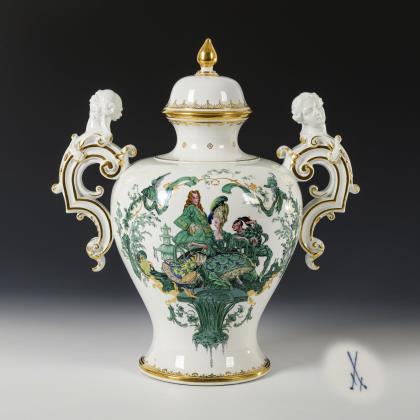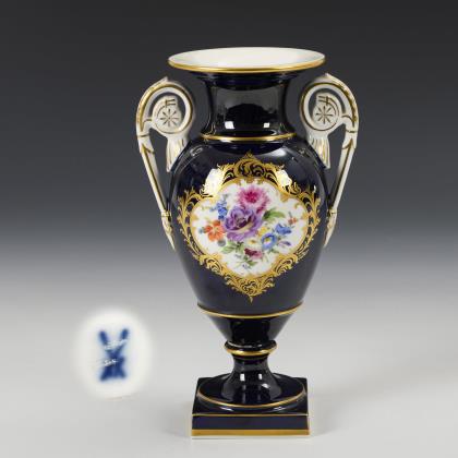 Ovoider Korpus, zwei Rosettenhenkel, Kraterhals und Rundfuß, auf Quadratplinthe. Schauseitig eine goldrocaillegerahmte Vierpasskartusche mit Blumenbukett