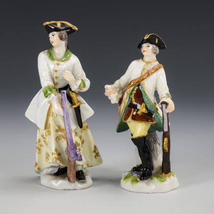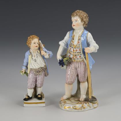 Pendants. 1x Schwertermarke mit Punkt, Pfeiffer-Zeit, 1924-1934, 1. Wahl, Modell-Nr. F 34 x: Auf einen zerbrochenen Spiegel zu ihren Füßen traurig blickendes Rokokomädchen. / 1x Knaufschwerter, ab 1850-1924, 1. Wahl, Modell-Nr. F 34: An einem Säulenstumpf stehender, schadenfroh auf den zerbrochenen Spiegel des Mädchens blickender Knabe