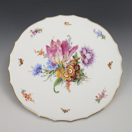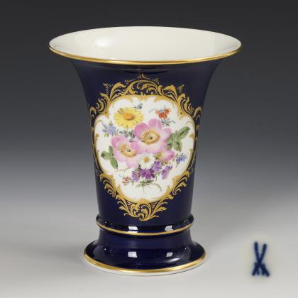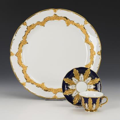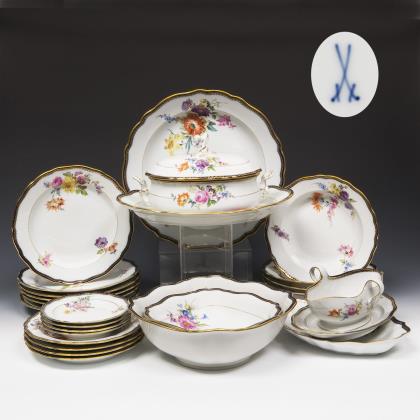 25 Teile. Form "Neuer Ausschnitt", Dekor-Nr. 111120. Farbige Blumenbemalung mit schräggestelltem Bukett und Einzelblüten, kobaltblauer Rand mit goldener "A-Kante", Goldstaffage. 6 Essteller, 4 Suppenteller, 4 große Dessertteller, 4 kleine Dessertteller, 1 Sauciere, 1 ovale Schale, 1 Terrine, 1 ovale Platte, 2 quadratische Schüsseln, 1 große runde Platte
