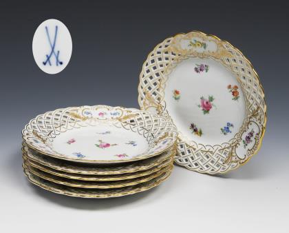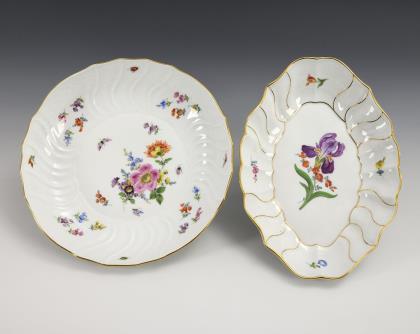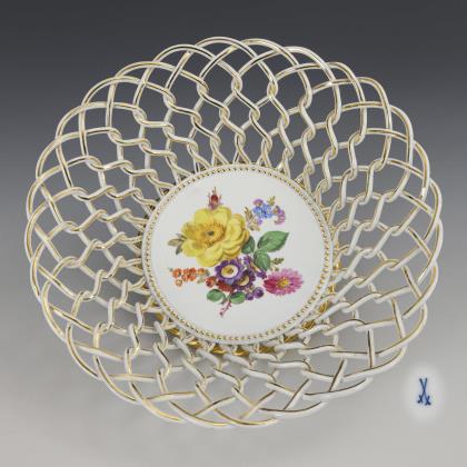 Farbig bemalt, gold staffiert, "Streublumendekor". Die durchbrochen gearbeitete Fahne mit drei Reliefkartuschen. Pressmarken, Schwertermarken, ein Teller 1968