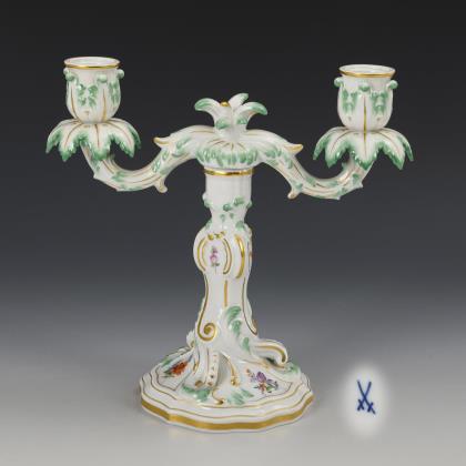 2-flammiger Rocailleleuchter mit grüner und goldener Konturierung sowie drei kleinen Blumenbuketts