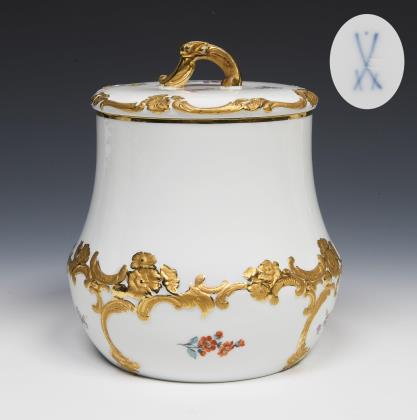 Modell-Jahr: 1900-1902. Vergoldetes Reliefdekor mit Blüten und Rocaillen, farbig bemalt, "Streublumen-Dekor", Goldstaffage. Ritzmarke, Pressmarke, Malermarke, Schwertermarke mit Punkt zweimal gestrichen