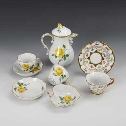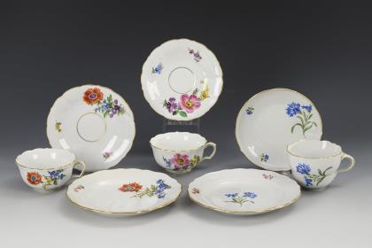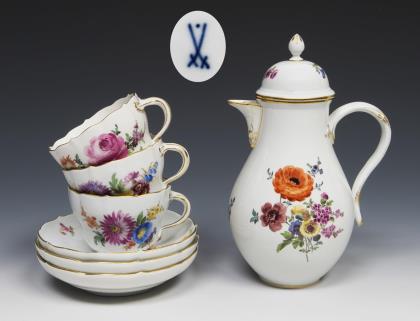 Form "Neuer Ausschnitt", farbige Blumenmalerei, gold staffiert. 22 Teile: Kaffekanne, Zuckerdose, Milchkännchen, kleine Gebäckschale, 6 Tassen, 6 Untertassen, 6 Dessertteller. Pressmarken, Schwertermarken, vier Schwertermarken zweimal gestrichen