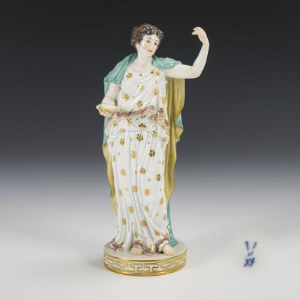 Auf einer Rundplinthe mit Mäanderfries stehende, antike Dame mit Schale