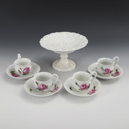 1 weißer Relief-Tafelaufsatz mit weinrebenreliefiertem Teller und gotisierend reliefiertem Fuß (H 13 cm). / 4 Malerei "Rote Rose": Tönnchentassen mit Schwanenhenkel (H 7,5 cm) und originalen Untertassen (Ø 14,5 cm)