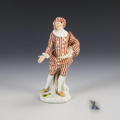 An einem Baumstamm stehende Figur des Mezzetino im gestreiften Kostüm