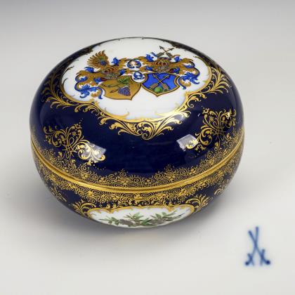 Runde Dose mit Kobaltfond und reicher, ornamentaler Goldmalerei. Auf dem Deckel eine Vierpasskartusche mit der Darstellung zweier Wappen mit Weintraube bzw. gekreuzten Pfeilen, auf dem Korpus zwei Kartuschen mit den Datierungen "2. September 1886" und "2. September 1911"