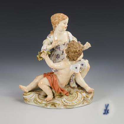 Auf einem Felssockel sitzendes Mädchen als Flora mit Blumengirlande, zu ihren Füßen ein Knabe als der Frühlingsbote Zephyr sitzend