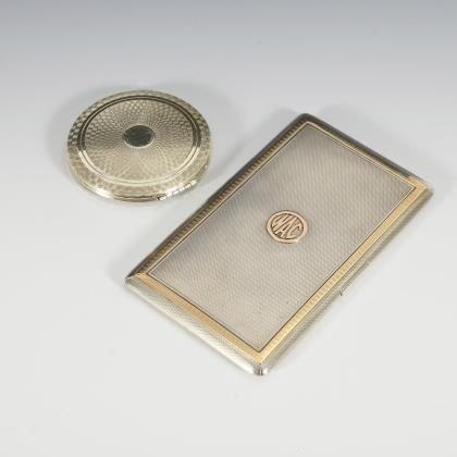 Runde Puderdose mit Innenspiegel (101 g, Ø 7 cm) und Zigarrettenetui (London 1919, 214 g, 14 x 8,5 cm). Beide fein guillochiert