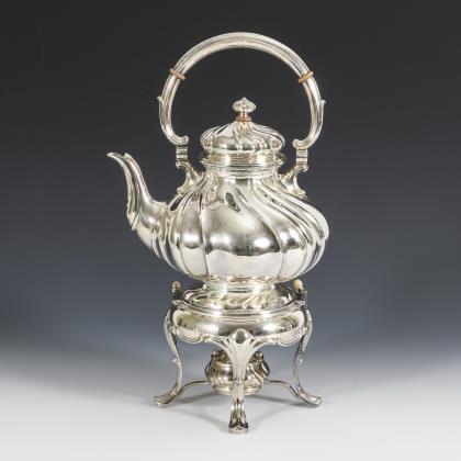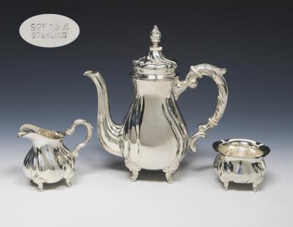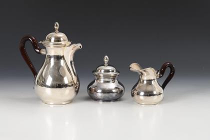 Mokkakanne, Milchkännchen, Zuckerschale. Godronierte, gebauchte Form mit Rocaillenhenkel auf vier Füßen. Kanne mit seitlichem Scharnierdeckel. Punzen: Halbmond und Krone, Feingehalt, Manufakturmarke