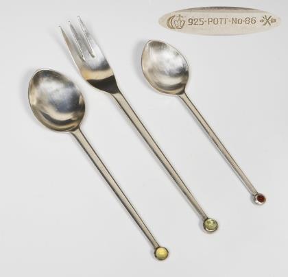 Modell-Jahr: 1955, Besteck-Muster-Nr. 86. Design-Klassiker mit farbigen Cabochons. Punzen: Halbmond und Krone, Feingehalt, Fabrikmarke