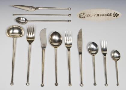Modell-Jahr: 1955, Besteck-Muster-Nr. 86. 186 Teile: 15 Tafelmesser, 15 Tafelgabeln, 12 Tafellöffel, 15 Menümesser, 15 Menügabeln, 10 Menülöffel, 15 Kuchengabeln, 12 Fischmesser, 10 Hummergabeln, 15 Dessertlöffel, 6 Kaffeelöffel, 6 Obstgabeln, 6 Obstmesser, 4 Limonadenlöffel, 4 Servierlöffel, 1 Schöpfkelle, 3 Soßenkellen, 2 Heber, 1 Buttermesser, 2 verschiedene Käsemesser, 6 kleine Serviergabeln, 6 mittlere Serviergabeln, 3 verschiedene Serviergabeln, 1 Fischserviergabel, 1 Fischserviermesser. Design-Klassiker, massive qualitätvolle Arbeit, Messer mit originalen rostfreien Stahlklingen. Punzen: Halbmond und Krone, Feingehalt, Fabrikmarke. Die "Historischen Modelle" von Pott werden auch künftig nach Vorbestellung einmal im Jahr produziert
