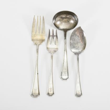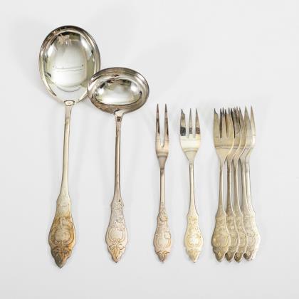 56 Teile. Jugendstil-Entwurf mit reliefierten Blütenmotiven, jeweils mit Monogrammgravur "M". 4 Speisegabeln, 18 kleine oder Vorlagegabeln, 3 Speisemesser, 2 Buttermesser, 2 Käsemesser, 8 Speiselöffel, 11 Dessertlöffel, 4 Spieße, 2 Servierlöffel, Saucenkelle und Bowlekelle