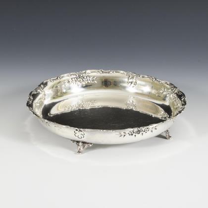 Flache Tafelschale mit Rosenreliefs, auf 4 Füßchen