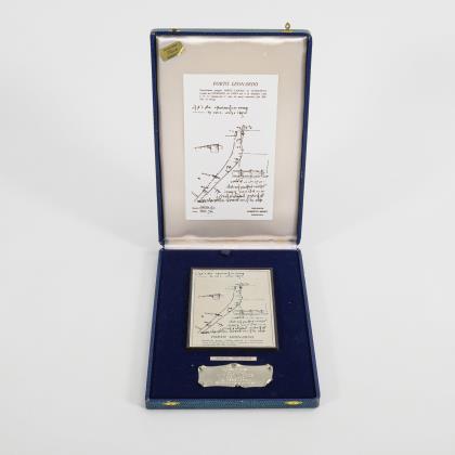 Silberplatte mit gravierter Reproduktion einer Zeichnung von Leonardo Da Vinci, die den Hafen von Cesenatico darstellt. Plattenmaß: 15,5 x 10,5 cm. Darunter Plakette mit italienischer Gravur: "Agertour Nautica Uno Per Classe Poliscafi di Cesenantico 29 Maggio - 2 Giugno 90"
