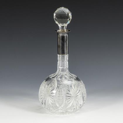 Kugelförmige, reich beschliffene Art-déco-Karaffe mit Glasstopfen und Silbermontierung am Hals