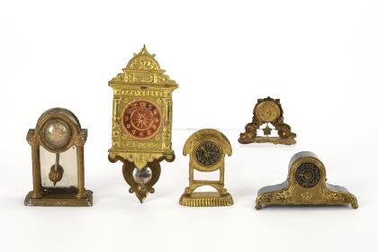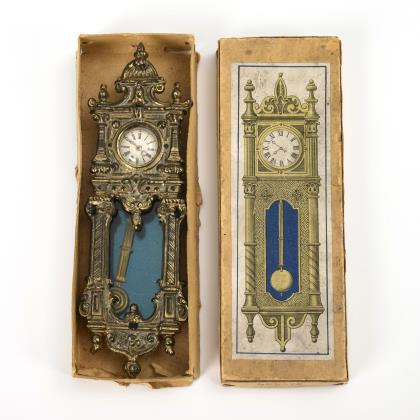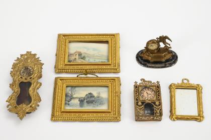 Wandregulator und 2 Tischuhren (H 5 - 12 cm), 2 Puppenstubenbilder und 1 Spiegel in Goldrahmen