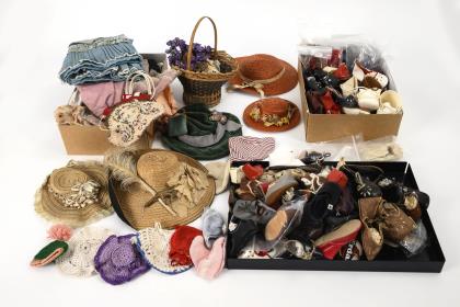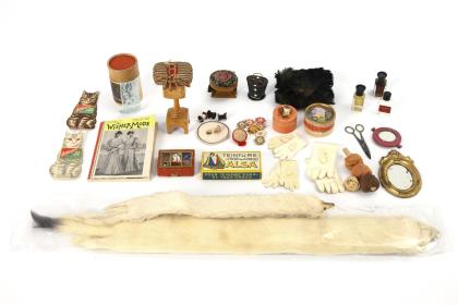 2 "Polarfuchs"-Stolas, dunkelbrauner Fellmuff mit Bärenkopf, 3 Paar weiße Handschuhe, "Wiener Mode"-Magazin mit Schnittmuster, Klöppelstock, Goldblechspiegel und etwas Nähzubehör