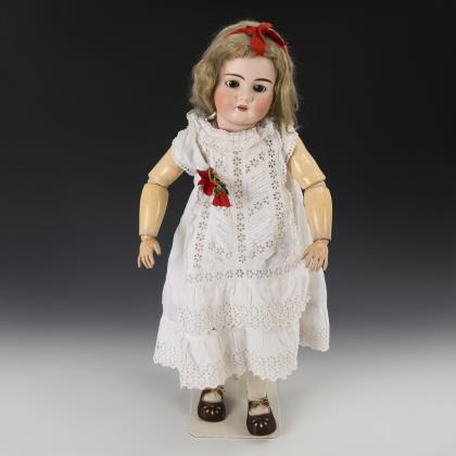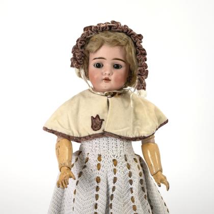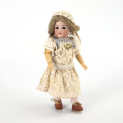 Kurbelkopf, braune Schlafaugen, Ohrlöcher, blonde Mohairperücke. 17-teiliger Gliederkörper. Weißes Kleid mit Lochstickerei, braune Wachstuchschuhe