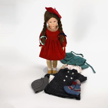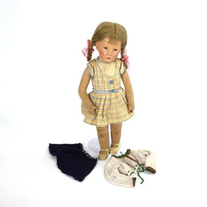 Typ VIII. Kurbelkopf aus Stoff, gemalte blaue Augen, braune Echthaarperücke mit geflochtenen Zöpfen. Stoffkörper mit Schlenkerarmen, Beine mit Scheibengelenken. Rotes Kleid, cremefarbene Wachstuchschuhe. Dazu 6 Kleidungsstücke und 3 Mützen