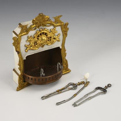 Weiß lackierter Blech-Kamin mit Rocaillenzier. Dazu 3 Teile Kaminbesteck aus Zinn