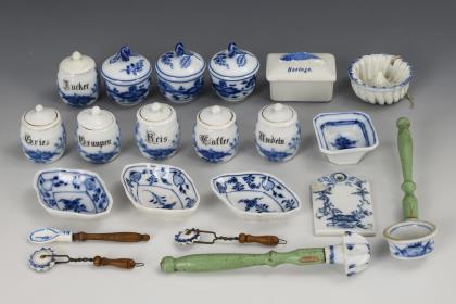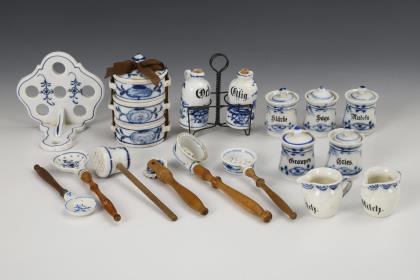 Konvolut blau-weißes Küchenporzellan für die Puppenstube.