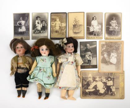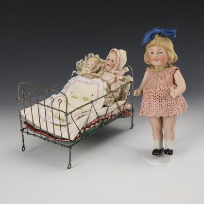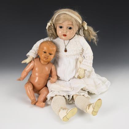Beide mit Kurbelkopf, blauen Schlafaugen und Gliederkörper. 1x zerlegt: restaurierter Kopf-Nr. 407 mit blonder Mohairperücke und cremefarbenes Gewand mit Stickereien. Mit Haarriss, starken Defekten und Ergänzungen. L ca. 60 cm. / 1x Kopf-Nr. 251 mit braunen Zöpfen, Toddlerkörper und weißem Kleid mit rosa Pünktchen. Perücke fest: Kopf nicht durchleuchtet, Körper mit Farbdefekten, 1 Finger fehlt. L 48 cm