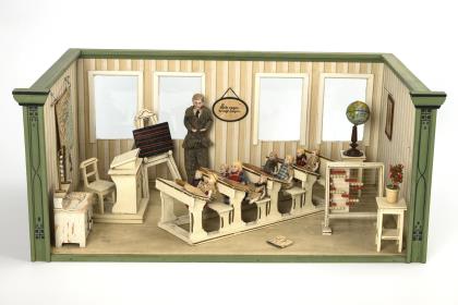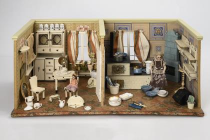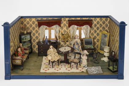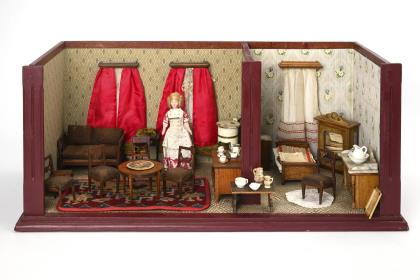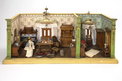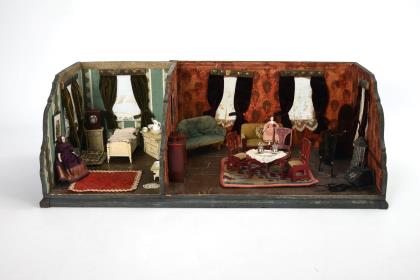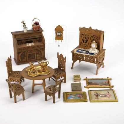 7 Gründerzeit-Möbel und Zubehör für die Puppenstube.