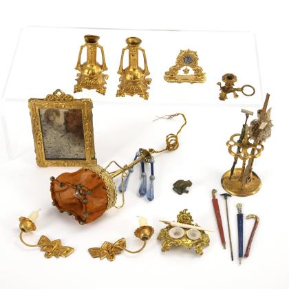 Ca. 16 Teile. Darunter Deckenlampe, Schreibzeug, Vasenpaar aus vergoldetem Zinn, Kaminuhr, Leuchter, 5 Spazierstöcke etc