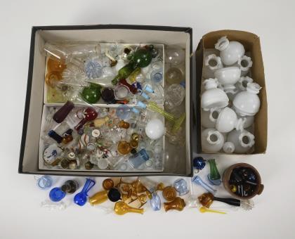 Verschiedenes Miniatur-Glas, darunter Petroleumlampenschirme aus Milchglas, Flaschen, Vasen, bemalte Serviceteile und 5x Fadenglas