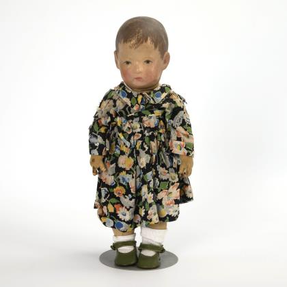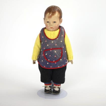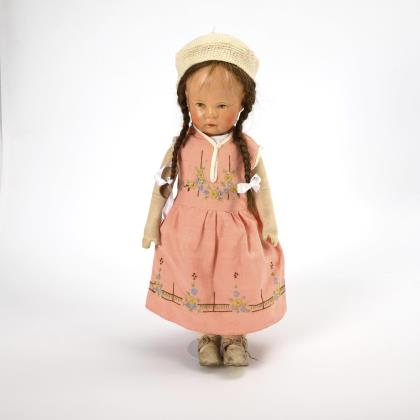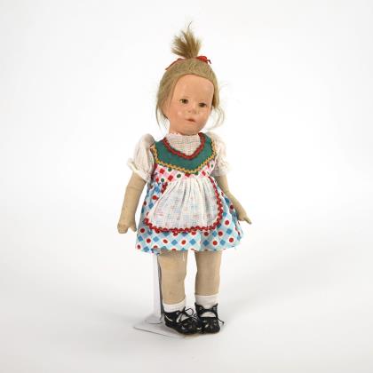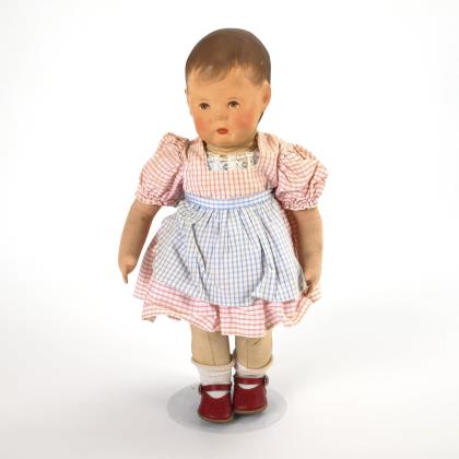 Typ I. Festgenähter Stoffkopf mit maskenartig bemaltem Gesicht und 3 Hinterkopfnähten. Stoffkörper mit Schlenkerarmen und breiten Hüften. Rosa kariertes Kleidchen mit blau karierter Schürze (in den 1950er Jahren nachgenäht), rote Lederschuhe