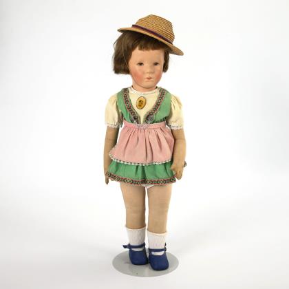 Typ VIII. Mit Stoff bespannter Kurbelkopf, gemalte braune Augen, abnehmbare hellbraune Echthaarperücke mit Bubikopf. Stoffkörper mit Schlenkerarmen, Beine mit Scheibengelenken. Grünes Dirndl, rosa Schürze, Strohhut, blaue Lederschuhe