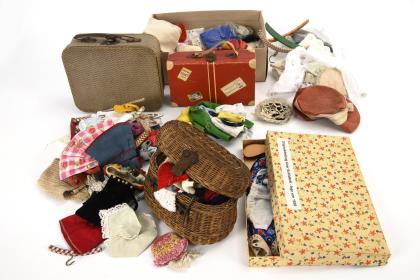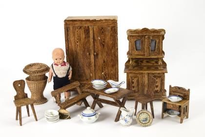 7 Puppenstubenmöbel mit gemalter Holzmaserung: Kleiderschrank, Küchenbuffet, Tisch, Bank, 2 Stühle und Beistellschränkchen, H 9,5 - 28,5 cm. / Cellba-Puppe aus Celluloid, in Strickkleidung, L 19,5 cm. / Dazu defekter Korb sowie einige Teile Porzellan für die Puppenküche, H 1 - 13 cm