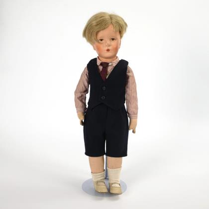 Typ VIII. Stoffbezogener Kurbelkopf mit gemalten braunen Augen, abnehmbare blonde Echthaarperücke. Stoffkörper mit Schlenkerarmen, Beine mit Scheibengelenken. Dunkelblauer Anzug mit Weste und kurzer Hose, weiße Wachstuchschuhe