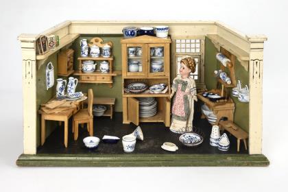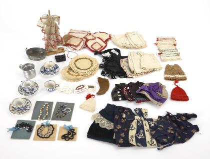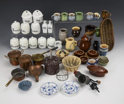 Konvolut Puppenstubenzubehör mit Keramik und Blech.