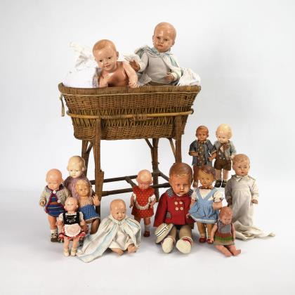 Umfangreiches Konvolut mit Puppen verschiedener Hersteller, darunter Schildkröt, Cellba, Bruno Schmidt etc. L 18 - 42 cm. Dazu ovaler, geflochter Korb auf Rattanständer, 54 x 55 x 32 cm