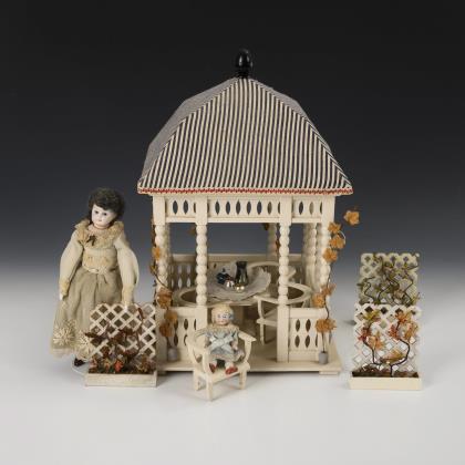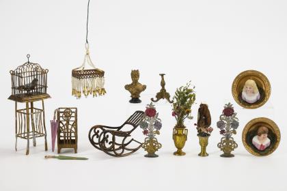 Schönes Konvolut mit Zinn für die Puppenstube, darunter Schaukelstuhl, Tisch, Deckenlampe mit Perlen, Vogelbauer, Vasen, 2 Wandteller mit Biskuitbüsten etc