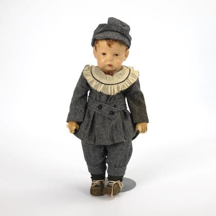 Typ I. Festgenähter Stoffkopf mit maskenartig bemaltem Gesicht und 3 Hinterkopfnähten. Stoffkörper mit Schlenkerarmen und breiten Hüften. Grauer Anzug, weißer Kragen, Schlägermütze, braune Lederschuhe