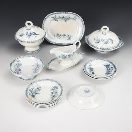 12 Teile. 4 Speiseteller, 3 Suppenteller, 2 Deckelschüsseln, Sauciere, Fußschale und ovale Platte. In altem Karton mit Defekten