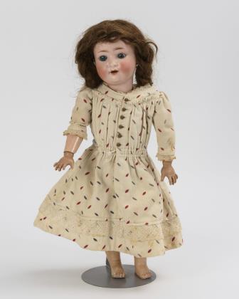 Kurbelkopf, blaue Schlafaugen, braune Echthaarperücke. 13-teiliger Gliederkörper mit gemarkten Celluloid-Händen von Schildkröt (SoR). Helles Kleid