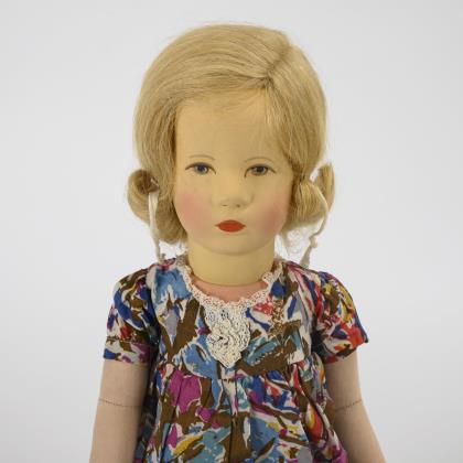 Typ IX. Kurbelkopf aus Kunststoff, gemalte braune Augen, blonde Echthaarperücke. Stoffkörper mit Schlenkerarmen, Beine mit Scheibengelenken. Kurzes gemustertes Kleidchen, schwarze Wachstuchschuhe