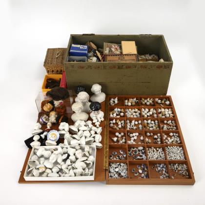 Grauer Holzkasten mit Nähzubehör, flacher Holzkasten mit Puppenaugen aus Glas, verschiedene unbemalte Puppenköpfe aus Biskuitporzellan und einige kleine Perücken