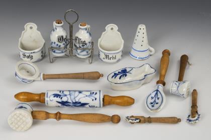 Ca. 13 Teile. Mit Essig-/Öl-Menage, 2 Wandmesten, Fischform, Teigrolle etc