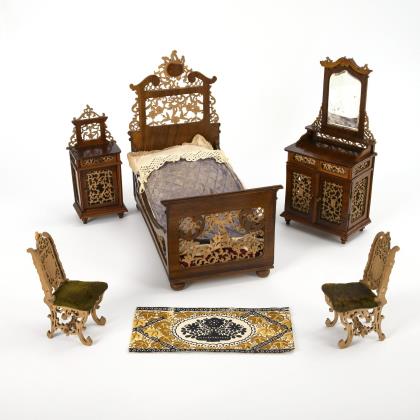 Elegante Möbel mit ausgesägtem Gitterwerk. Bett (28 x 34 x 20 cm), Nachtschränkchen (H 22 cm), Halbschrank mit Aufsatzspiegel (H 32 cm) und 2 Stühle (H 16,5 cm)