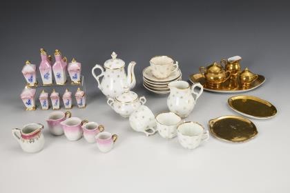 6 Teile Goldgeschirr, 9 rosa Gewürzgefäße und 4 Kännchen, 12 Teile Puppenstuben-Kaffeegeschirr mit Goldsternchen
