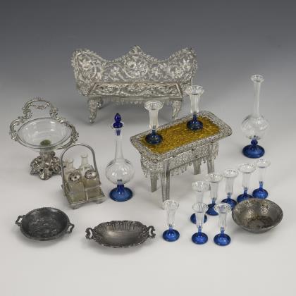 2 Zinnmöbel (Bank und Tisch), verschiedenes Zinnzubehör sowie 2 Karaffen und 10 Gläser mit blauem Fuß